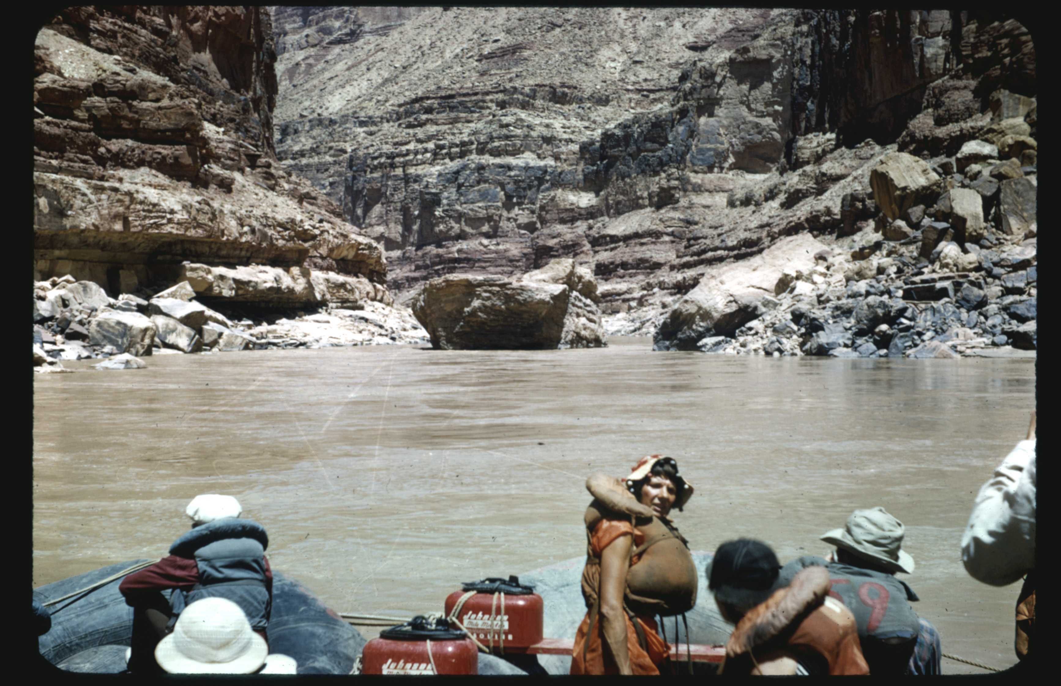 02-03.jpg Text: (Kodachrome red 15): "35" Georgie at the helm of the big raft.