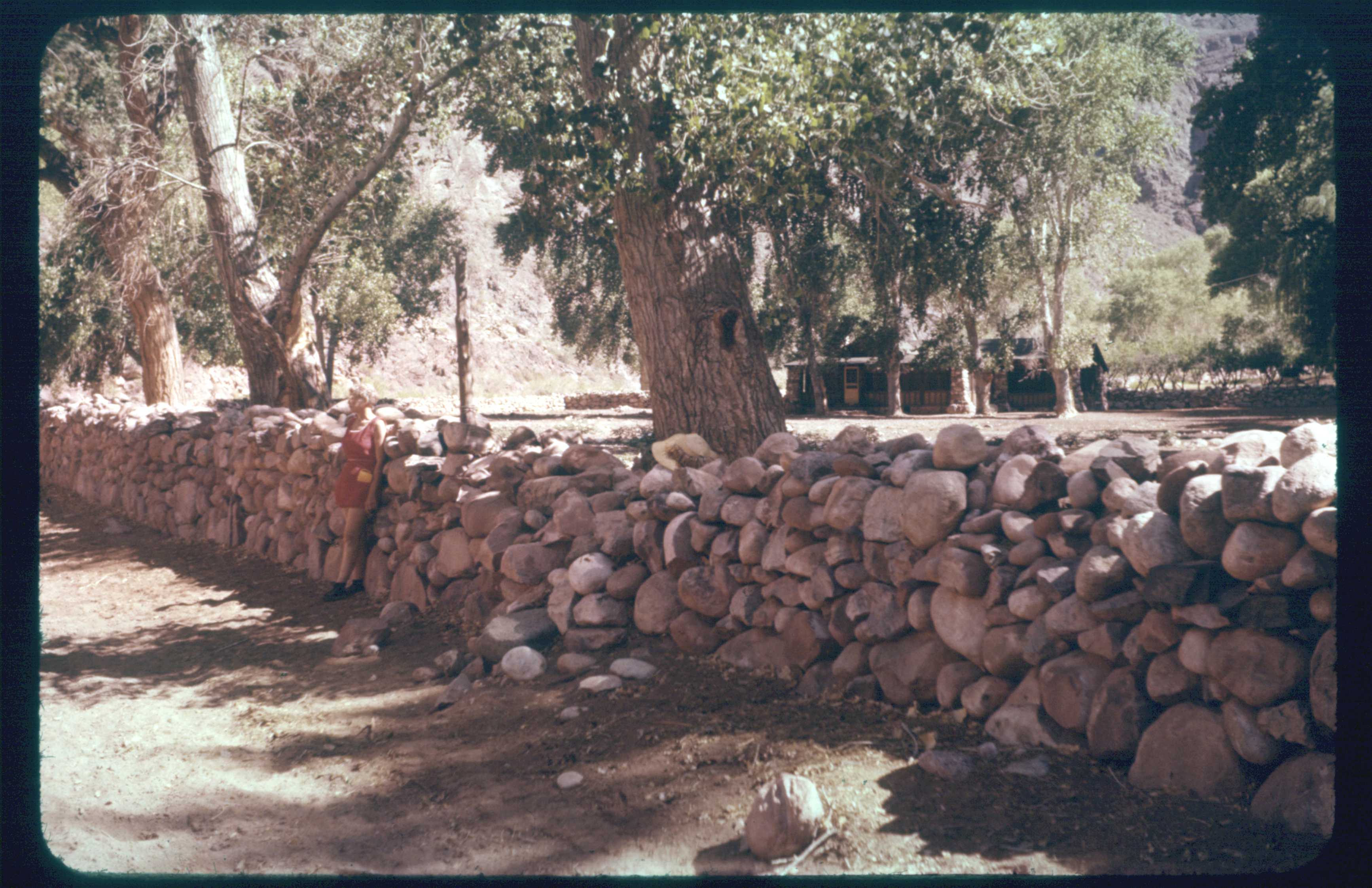 04-13.jpg 04-13.jpg Text: (Ektachrome): Irene standing by stone wall at Phantom Ranch.