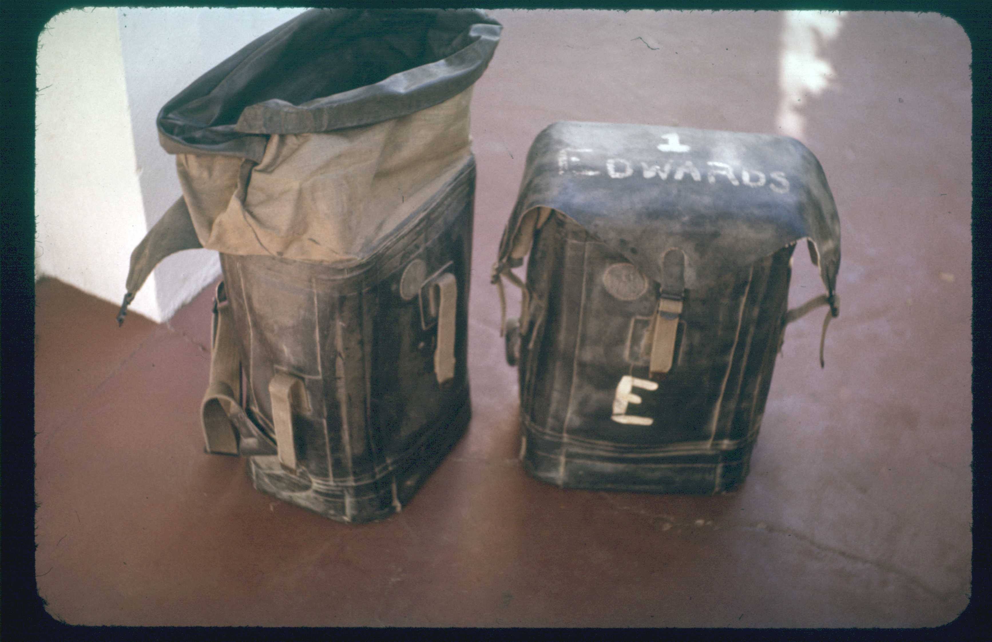 01-11.jpg Text: (Ektachrome): "13" These are the waterproof bags that contain each person's personal equipment. Each person gets only one bag.
