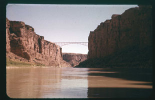 01-08.jpg Text: (Kodachrome red 36): "10" The highway bridge across the Colorado. Soon the party will pass under this bridge.