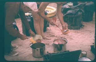 01-22.jpg Text: (Ektachrome): "24" Georgie's famous vegetable stew. Notice the child's wading pool in the background. All the other foodstuffs, condiments etc. are inside this wading pool where they are safe from sand being kicked into them.