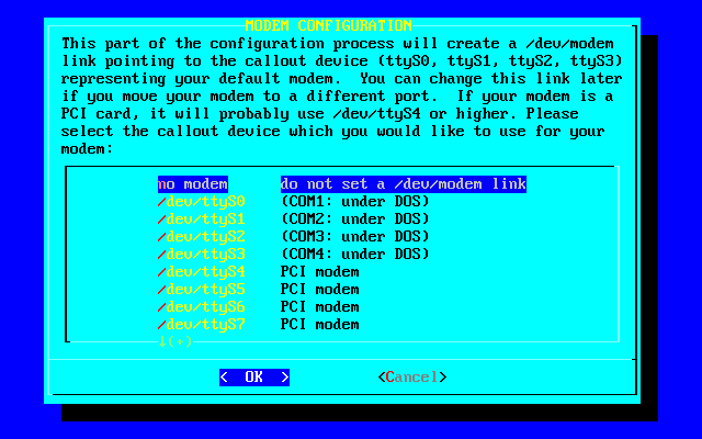 You will be prompted for modem information. More specifically, you will be asked whether you have a modem, and if so, what serial port it is on.
